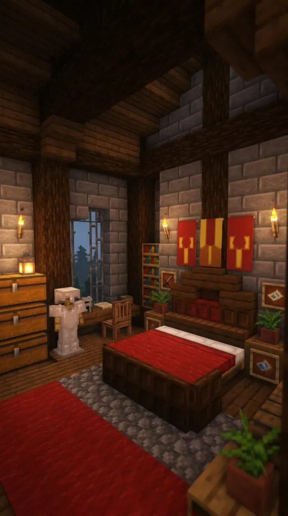 To build this bedroom step by step, construct a stone room inside the castle tower or hallway. Place the bed against the center of a wall and frame it using trapdoors. Add banners above the bed to simulate decorative tapestries. Install torches along the walls for lighting. Chests and armor stands can serve as storage and decoration, completing the medieval bedroom design.
