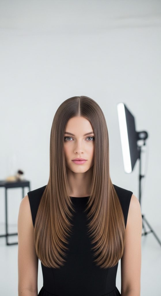 To create this style, part the hair evenly down the center. Straighten each section carefully using a flat iron. Ensure both sides remain balanced in volume and length. Apply smoothing serum for a polished finish. Use hairspray to maintain alignment. This method ensures a consistent and clean appearance.