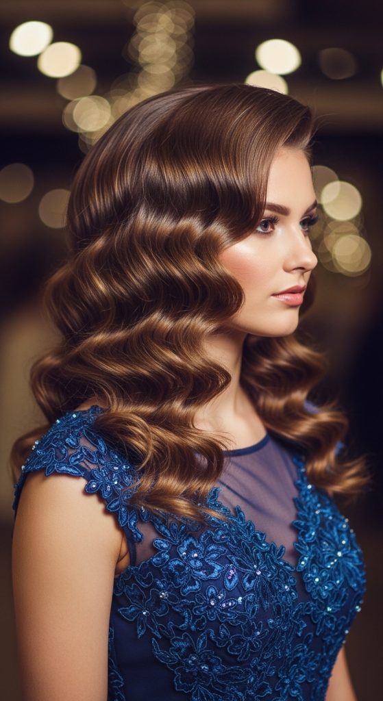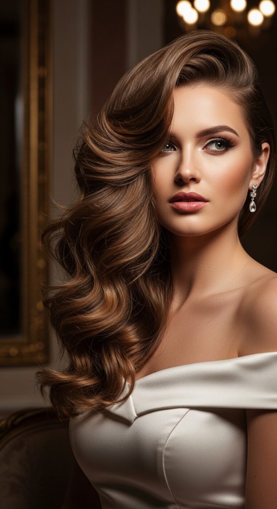 Side-parted waves combine volume with directional styling, creating a more defined and formal appearance. The deep side part adds asymmetry, which enhances the overall structure of the hairstyle. This approach is useful for balancing facial proportions and adding dimension to flat hair. The waves provide movement while the side part creates a focal point. This combination is frequently used in Pinterest ideas because it delivers both elegance and visual interest. It is suitable for various hair textures and works well with layered cuts.
