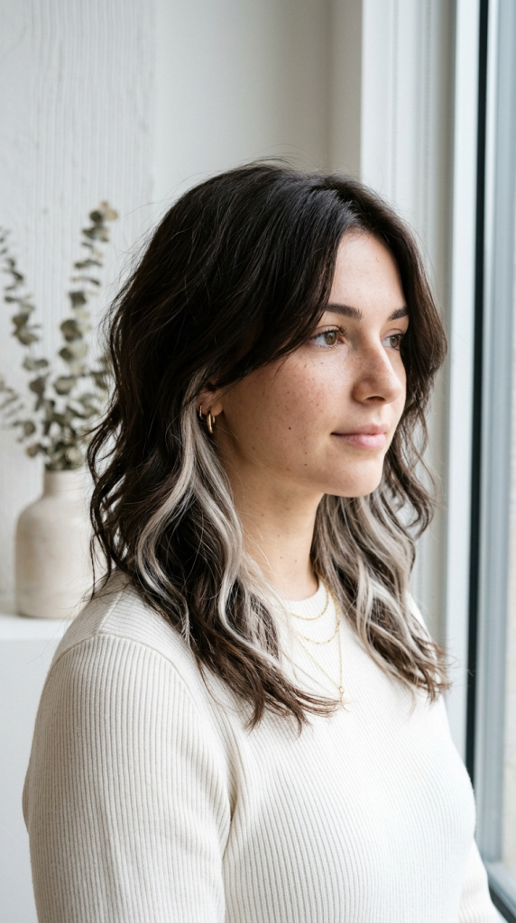 Ash blonde peekaboo color introduces cool toned highlights that blend subtly with darker hair.