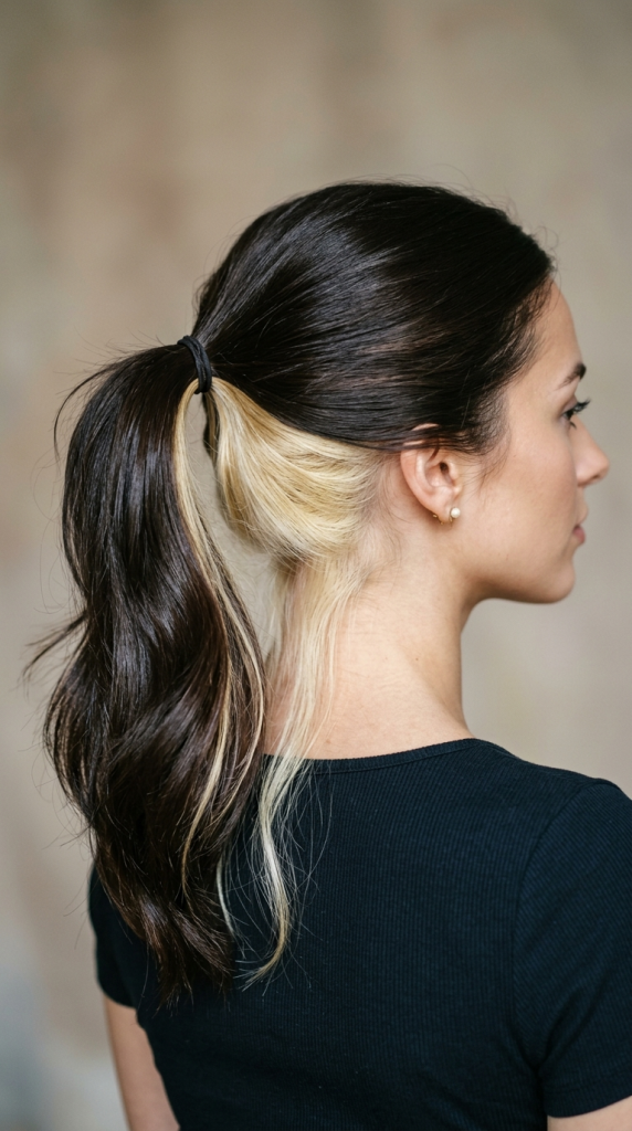 A ponytail hairstyle lifts the upper hair layers, revealing the hidden blonde section beneath.