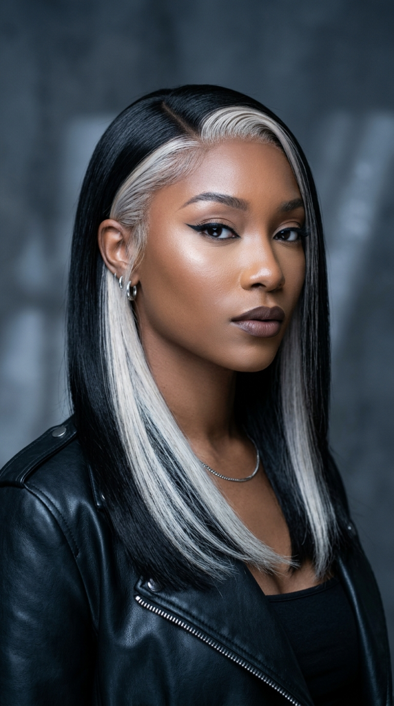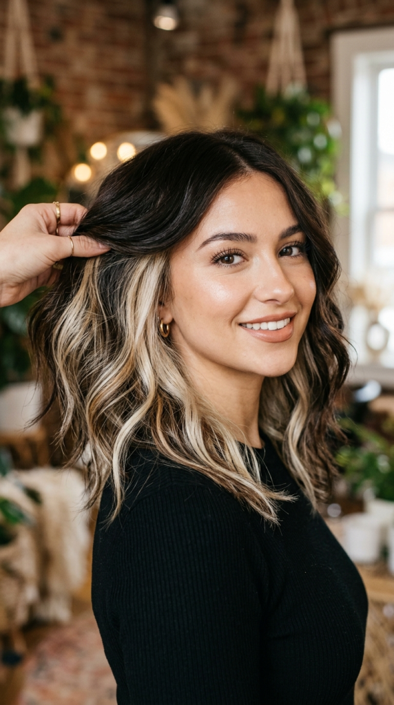Loose waves are particularly effective because they create natural movement throughout the hair. As the strands curve and shift, the blonde section appears intermittently.