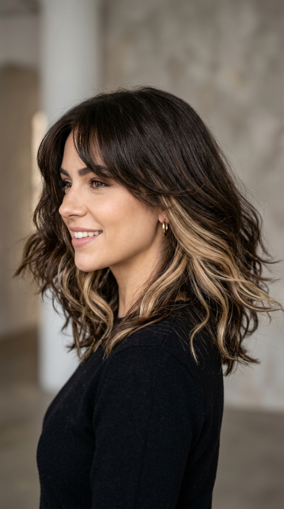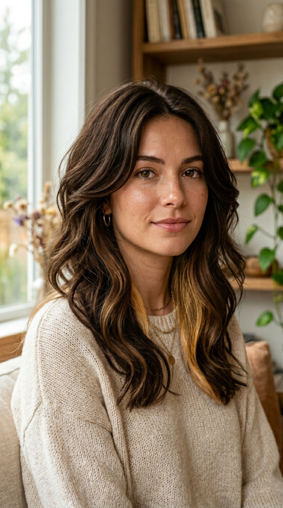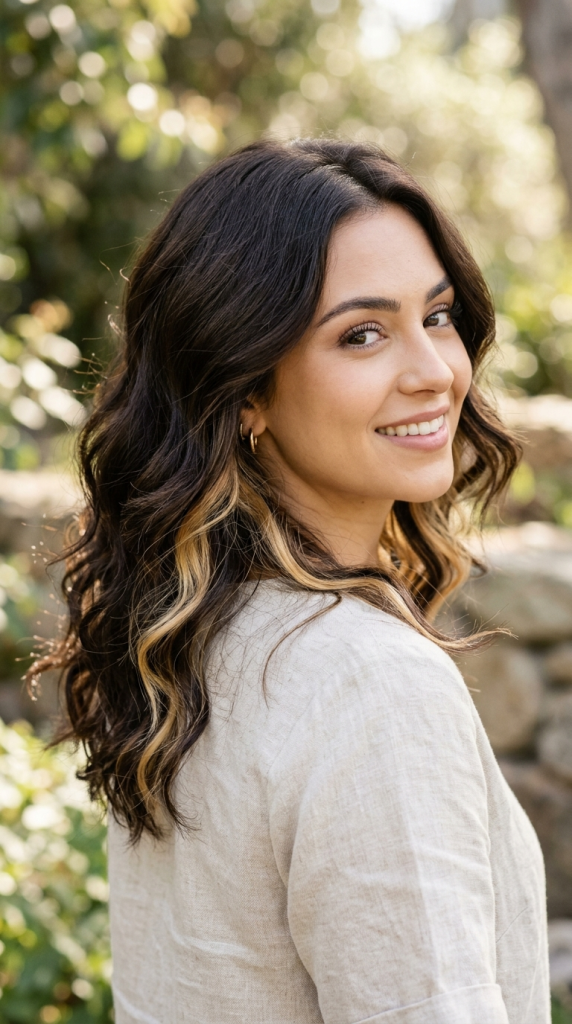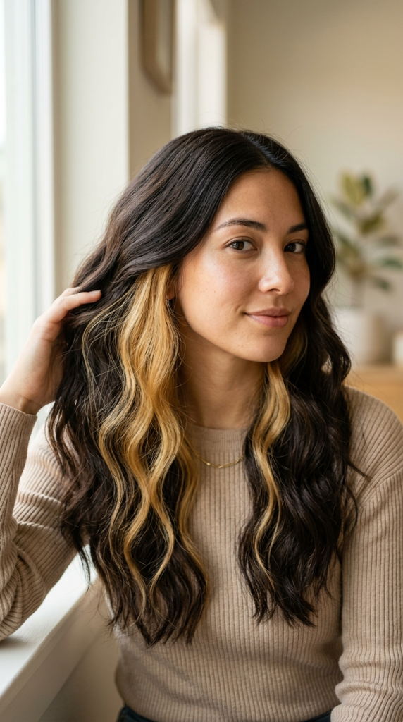Loose waves naturally separate hair strands, allowing hidden blonde sections to appear throughout the hairstyle.