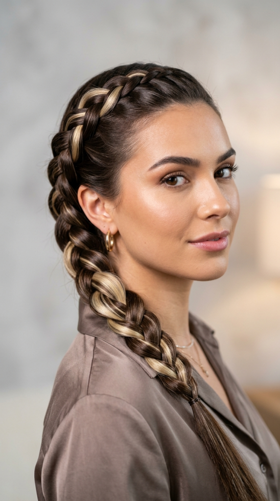 After coloring the hidden section blonde, divide the hair into three strands and form a braid. The blonde strands will appear throughout the braid pattern.