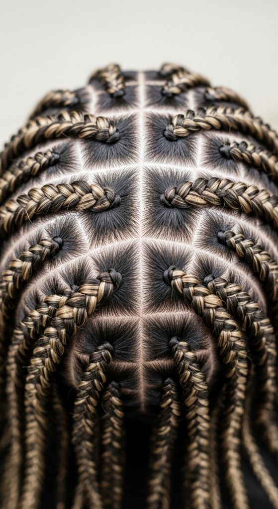 To create this style, part the hair into curved sections and braid along the curves. Maintain consistent spacing. This ensures a smooth and dynamic pattern.