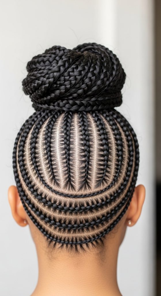 The zebra braids bun combines patterned braids with an updo. This design keeps the hair secured while showcasing the pattern.