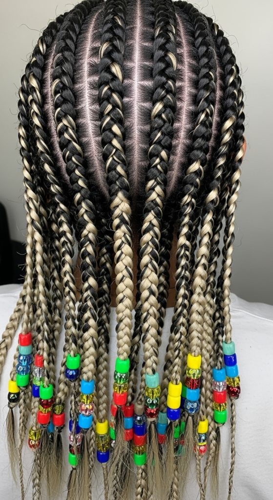 Zebra braids with beads enhance the striped pattern by adding decorative elements at the ends of the braids. The beads create visual weight and movement, making the hairstyle more dynamic.