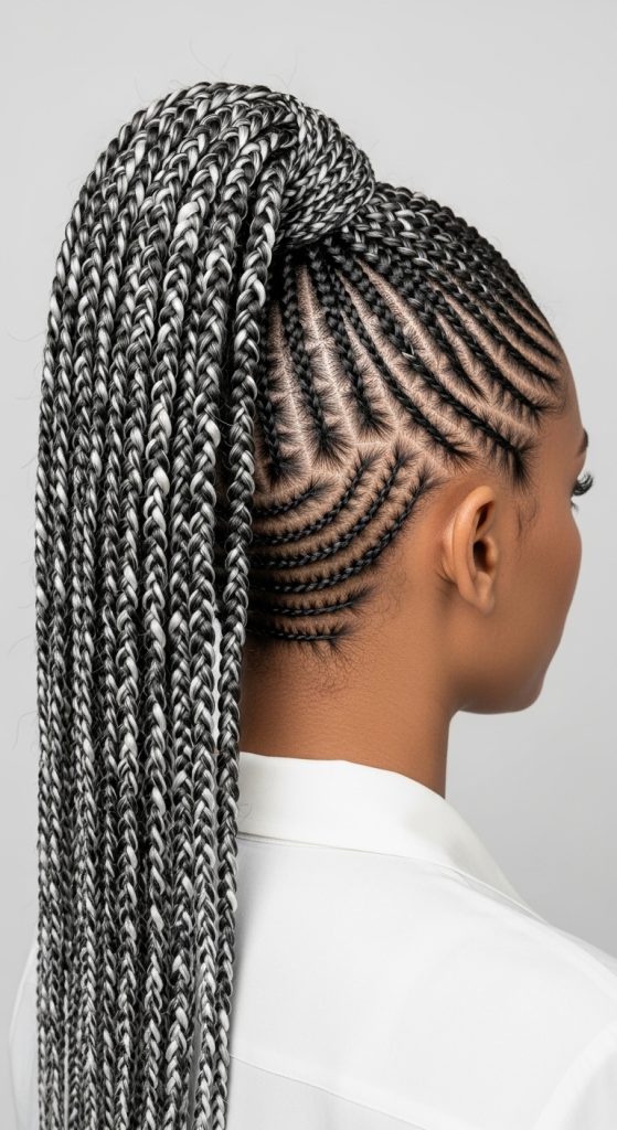 The zebra braided ponytail combines patterned braids with a gathered ponytail. This style creates a clean and organized finish.