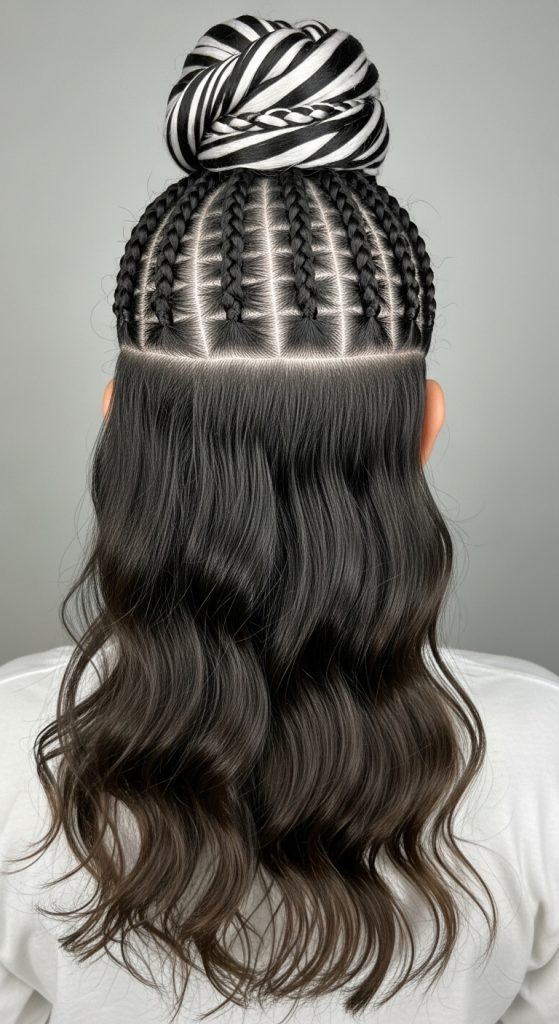 To create this style, braid the top section into zebra patterns and leave the rest loose. Secure the top section at the back. This method ensures a balanced appearance.