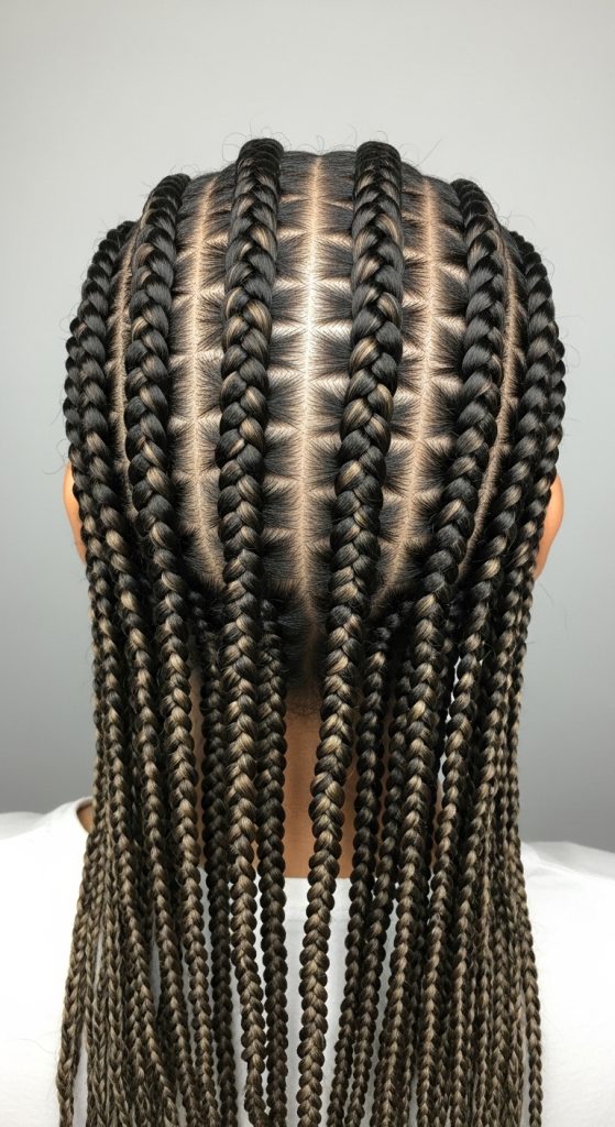 Classic zebra cornrows focus on straight-back braids with evenly spaced sections that create a striped pattern across the scalp. This design emphasizes symmetry and precision, making it a common choice in Pinterest inspiration. The pattern is created by alternating the width of sections, giving a visual effect similar to stripes. This hairstyle is practical and long-lasting, as cornrows keep the hair secured close to the scalp. It is considered beginner friendly for those familiar with basic braiding techniques. The concept relies on consistent spacing and uniform braid tension to maintain a clean and organized appearance. This style works well for both casual and structured settings.